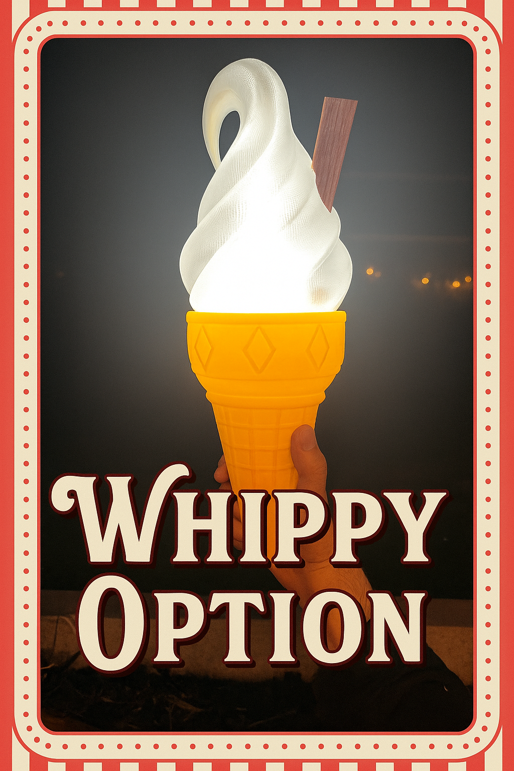 Scoop / Whip and light options! - look at the main photos to see what the scoop style you choose will look like. When you select it in the sale options it will not change the image but don't worry, the cone will come with the combination you choose.
